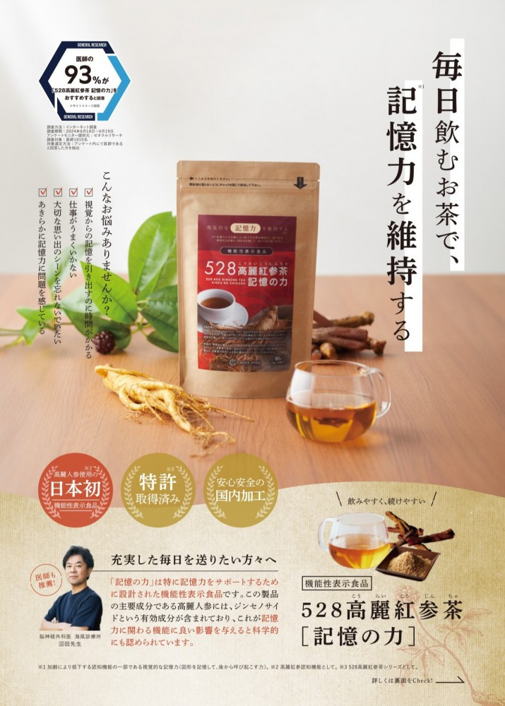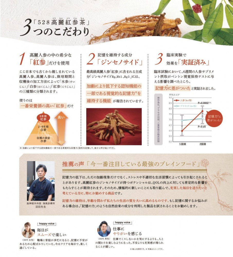 Sản phẩm này chứa ginsenosides Rg1, Rb1 và Rg3. Ginsenosides Rg1, Rb1 và Rg3 được báo cáo là có tác dụng duy trì trí nhớ thị giác (khả năng ghi nhớ hình ảnh và nhớ lại sau này), một phần của chức năng nhận thức vốn suy giảm theo tuổi tác. Dành cho những người lo lắng về tình trạng suy giảm trí nhớ.