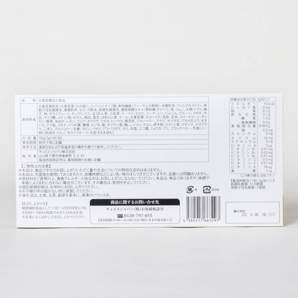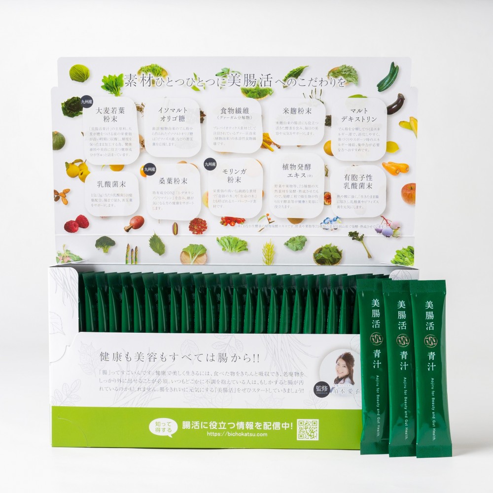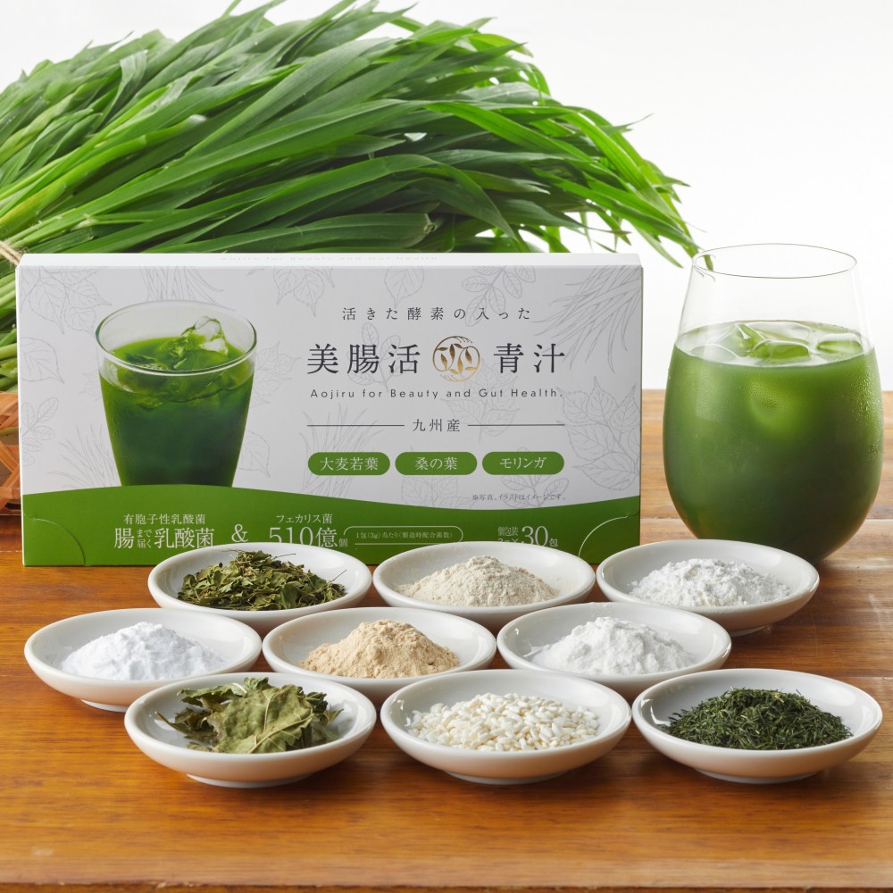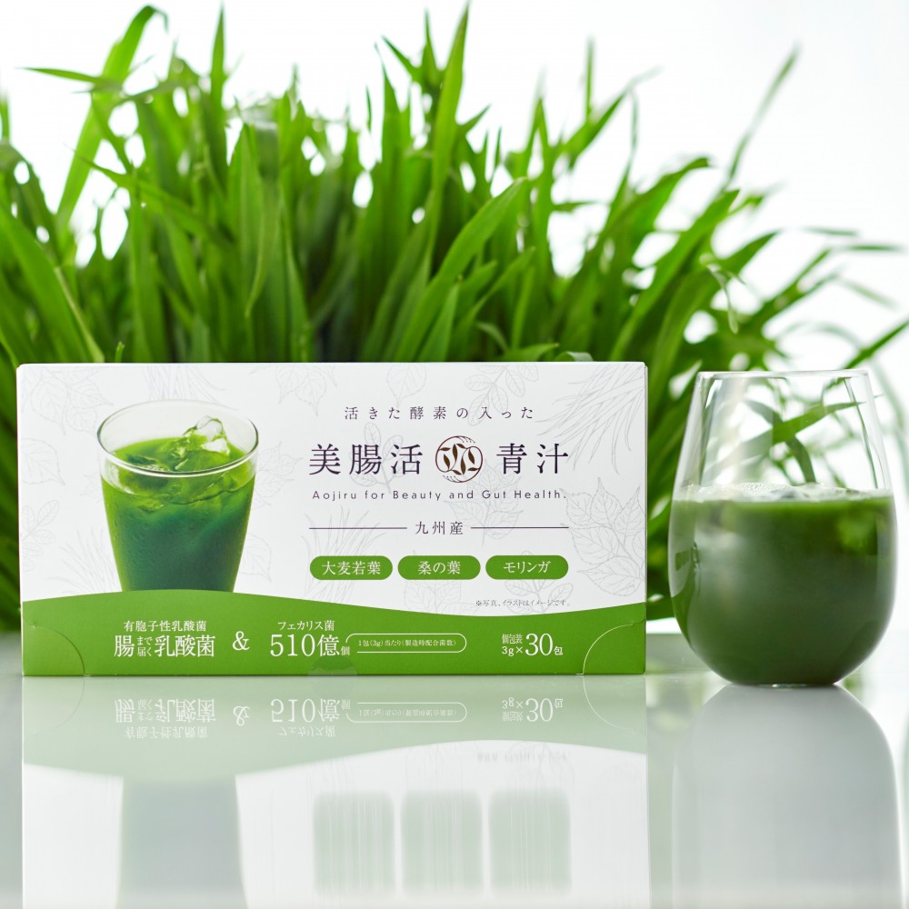 Đây là một loại nước xanh được thiết kế dựa trên sự giám sát của Giáo sư Suyamoto Aiko, một Giảng viên được chứng nhận của Hội đồng Chăm sóc Đẹp của Nhật Bản, để hỗ trợ sức khỏe đường ruột và tạo năng lượng. Nguyên liệu được lựa chọn cẩn thận, bao gồm lá lúa mạch non được chăm sóc cẩn thận tại trang trại của công ty ở tỉnh Kagoshima làm nguyên liệu chính, kết hợp với lá dâu tằm và cây moringa.